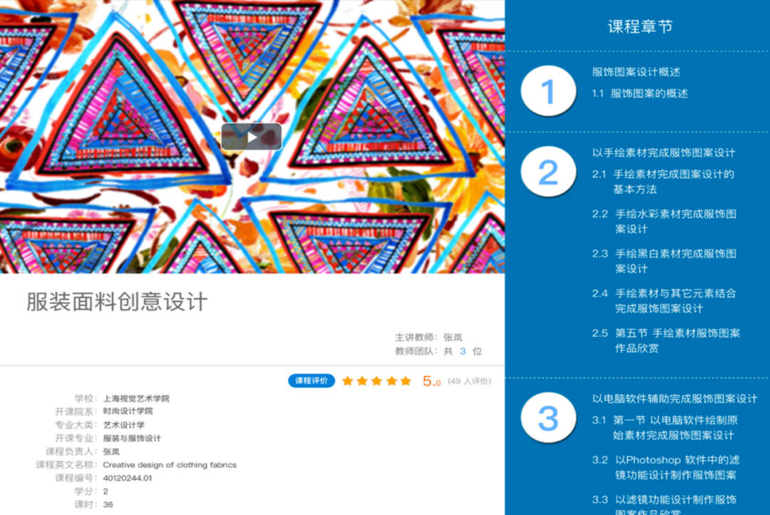 主讲教师出版课程配套规划教材: 2019年出版 “十三五”部委级规划教材《服饰图案设计》为本课程主讲教材;2023年出版“十四五”部委级规划教材《创意手工印染》为本课程辅助教材;构建国际专家+行业专家+本校教师三位一体教学团队;联合行业内各领域6家龙头企业,作为实践合作基地,完成12个真题真做实践项目,围绕成果案例丰富教学资源,收录发布于线上课程平台。
