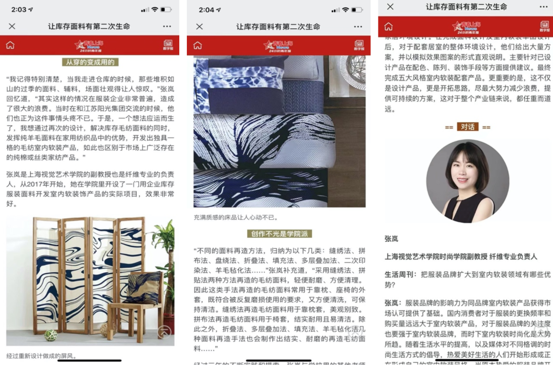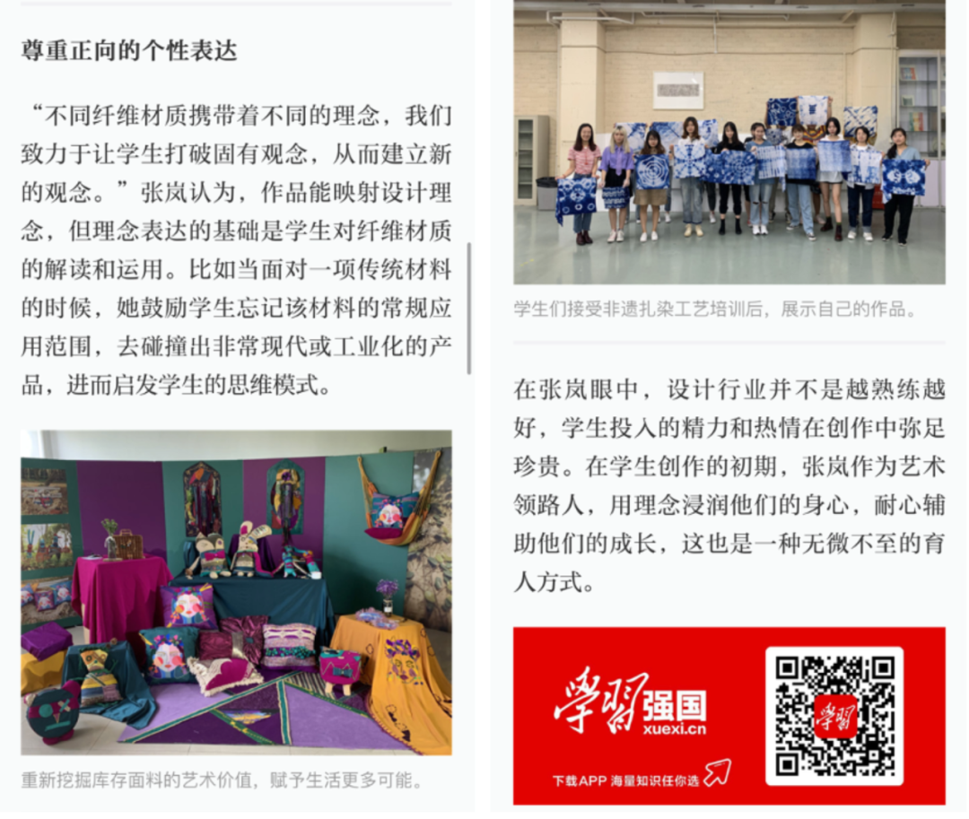 权威媒体对教学成果进行报道:学习强国平台以题目“上海视觉艺术学院教师张岚:艺术为经,思政为纬,培育学生美的理念”报道课程中艺术设计与思政理念的有效结合;中央电视台《央视新影发现之旅行》纪录片报道课程装饰方案落地成果;上海《青年报》详细报道了江苏阳光集团面料再开发项目课程,称我们的设计“让面料有了二次生命”。