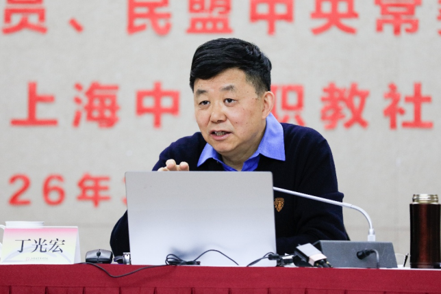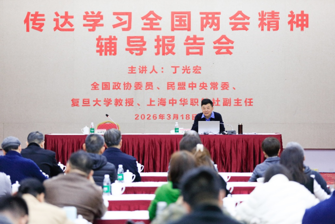 3月18日,学校召开全国两会精神辅导报告会,邀请全国政协委员、民盟中央常委、复旦大学教授、上海中华职教社副主任丁光宏来校作十四届全国人大四次会议、全国政协十四届四次会议精神辅导报告。校党委书记吴嘉敏主持会议,常务副校长林敏,校党委副书记、纪委书记俞振伟,校党委副书记、副校长李梅,副校长唐竭婧及全体中层干部、思政教师和辅导员参加学习。